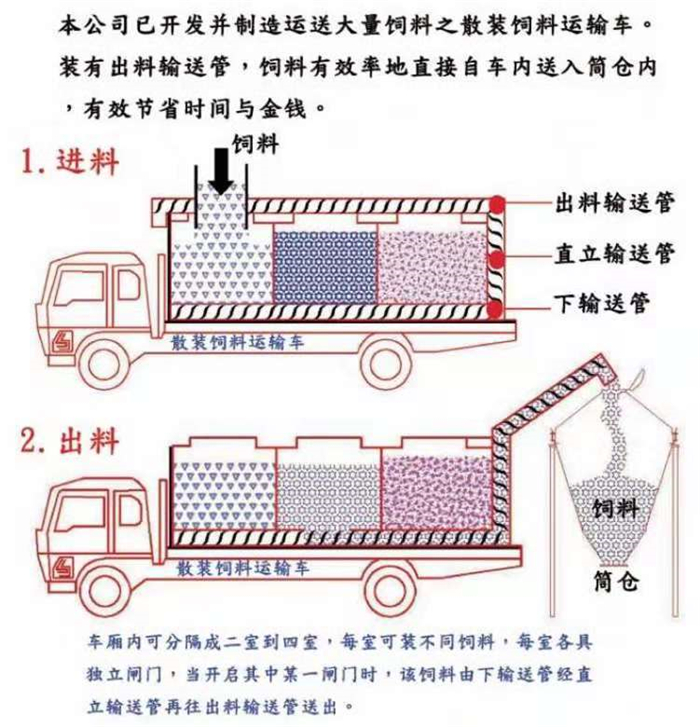 ★罐體內(nèi)可加裝分倉(cāng),可同時(shí)運(yùn)輸多種不同類的飼料或膨人介質(zhì)。部件標(biāo)準(zhǔn)化,容易維修保養(yǎng)。