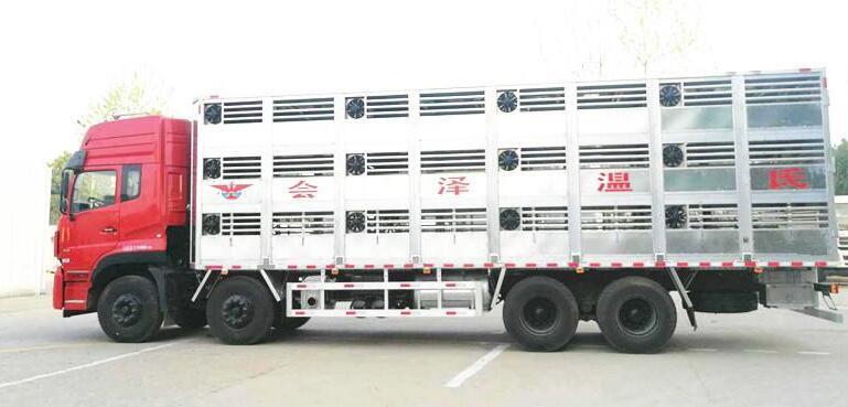 【豬苗車】上裝配置:外玻璃鋼,內(nèi)不銹鋼,兩層液壓升降層板,尾部液壓翻轉(zhuǎn)上豬平臺(tái),層板為不銹鋼骨架鋪鋁花紋板。外部電動(dòng)升降窗,排氣扇,柴油發(fā)電機(jī),暖風(fēng)加熱,喂水系統(tǒng),凈水箱、污水