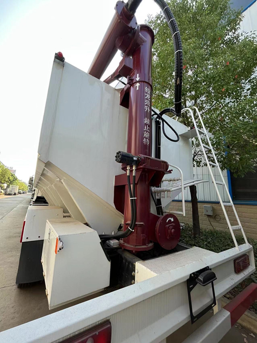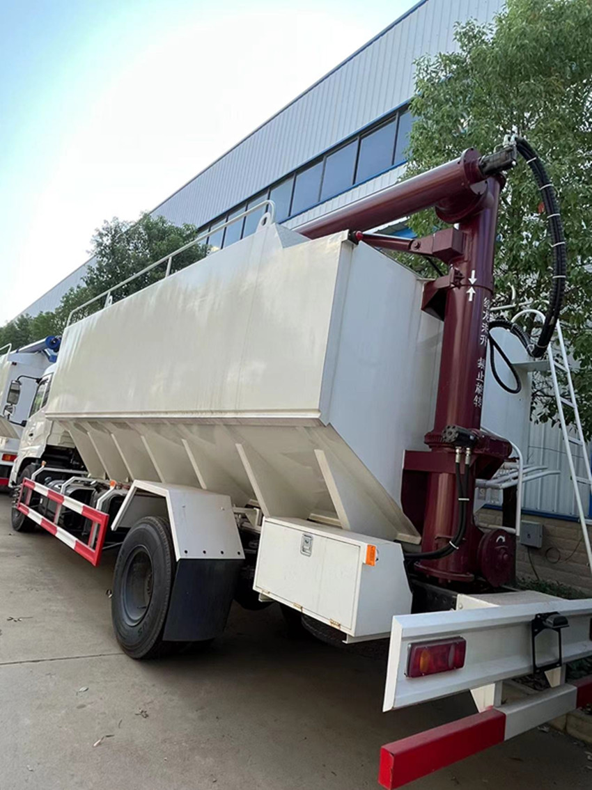 散裝飼料運輸車,散裝飼料車的飼料罐架設在卡車的底盤上,罐頂開有進料口.頂部的一根螺旋輸送卸料管(俗稱卸料絞龍)則可自由回轉(zhuǎn)和抬升,抬升的仰角可達60度。運輸時,頂部的螺旋管平臥在罐頂;卸料時則抬起,使管端的出料口與畜禽飼養(yǎng)場貯料罐頂部的進料門相接,駕駛室內(nèi)裝有操縱裝置(操縱裝置也可裝置在罐體尾部),卸料時通過車底的動力輸出軸和減速器來驅(qū)動螺旋,以完成卸料。