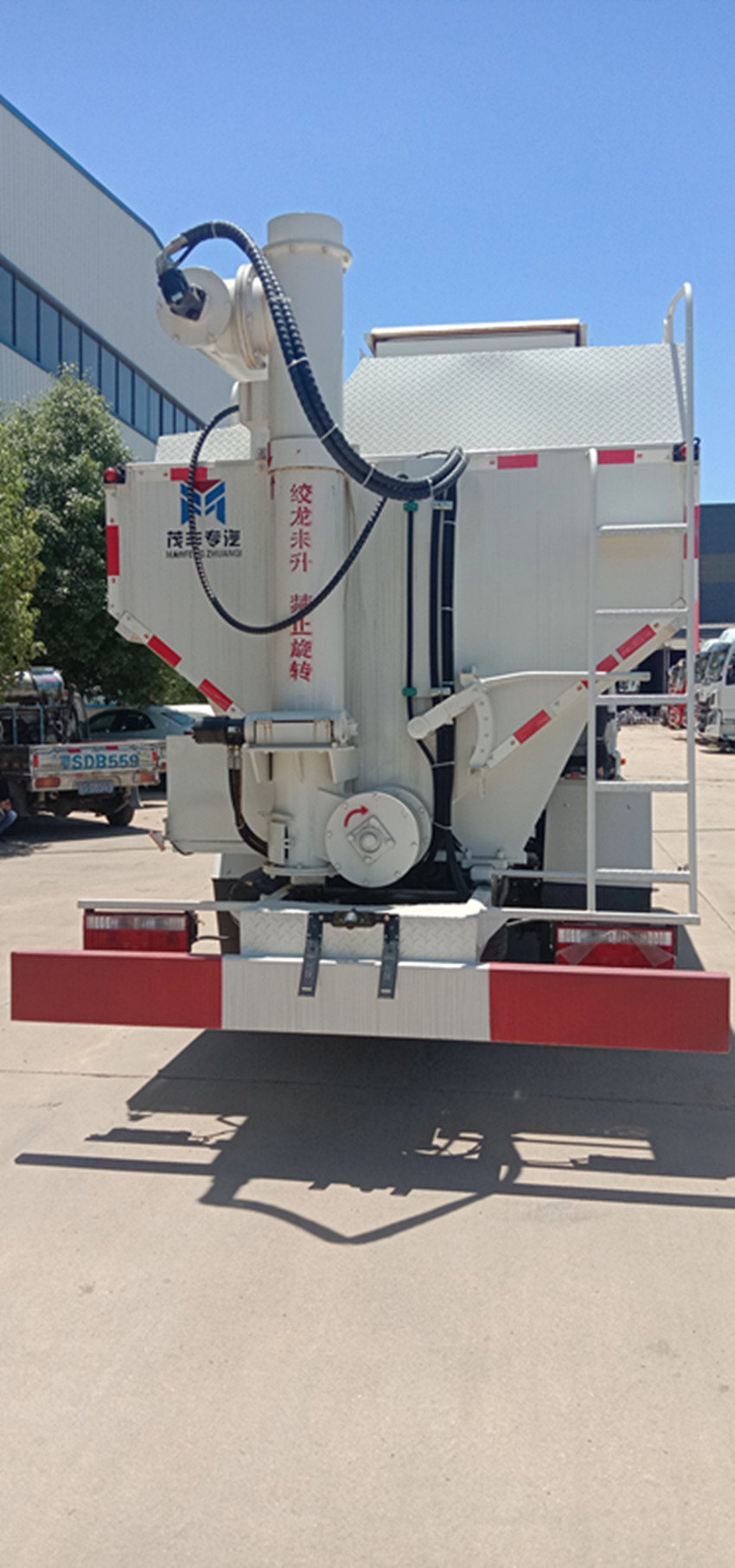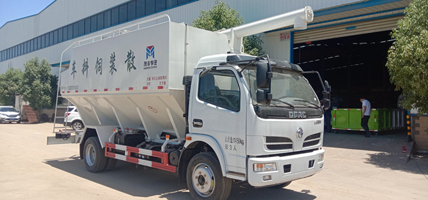 散裝飼料運(yùn)輸車,散裝飼料車的飼料罐架設(shè)在卡車的底盤上,罐頂開有進(jìn)料口.頂部的一根螺旋輸送卸料管(俗稱卸料絞龍)則可自由回轉(zhuǎn)和抬升,抬升的仰角可達(dá)60度。運(yùn)輸時(shí),頂部的螺旋管平臥在罐頂;卸料時(shí)則抬起,使管端的出料口與畜禽飼養(yǎng)場(chǎng)貯料罐頂部的進(jìn)料門相接,駕駛室內(nèi)裝有操縱裝置(操縱裝置也可裝置在罐體尾部),卸料時(shí)通過(guò)車底的動(dòng)力輸出軸和減速器來(lái)驅(qū)動(dòng)螺旋,以完成卸料。