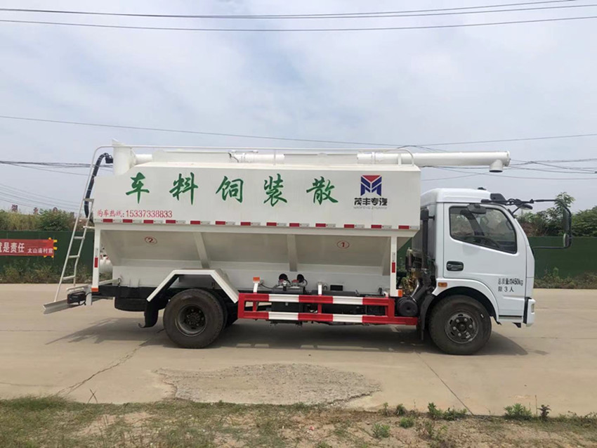 散裝飼料運輸車,散裝飼料車的飼料罐架設(shè)在卡車的底盤上,罐頂開有進料口.頂部的一根螺旋輸送卸料管(俗稱卸料絞龍)則可自由回轉(zhuǎn)和抬升,抬升的仰角可達60度。運輸時,頂部的螺旋管平臥在罐頂;卸料時則抬起,使管端的出料口與畜禽飼養(yǎng)場貯料罐頂部的進料門相接,駕駛室內(nèi)裝有操縱裝置(操縱裝置也可裝置在罐體尾部),卸料時通過車底的動力輸出軸和減速器來驅(qū)動螺旋,以完成卸料。